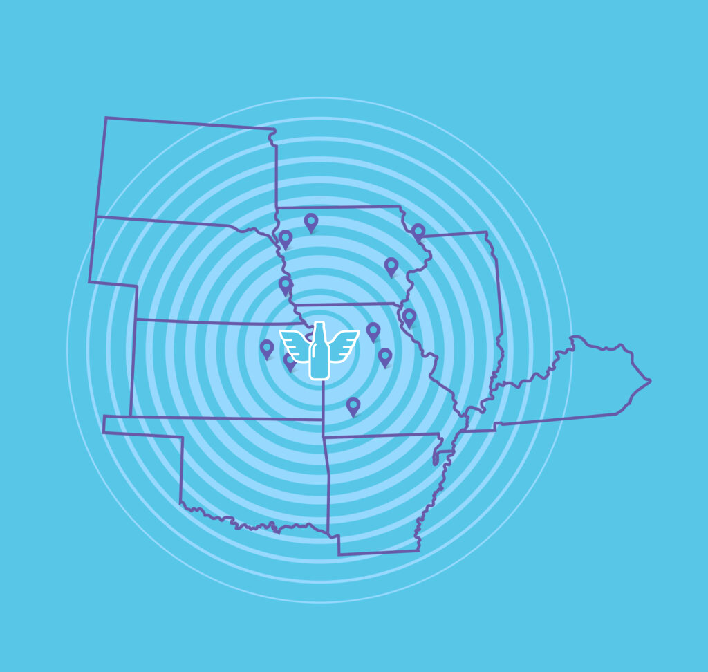Dubuque, IA • Iowa City, IA • Sioux City, IA • Spencer, IA • Topeka, KS • Lawrence, KS • Jefferson City, MO • Moberly, MO • Springfield, MO • Omaha, NE • Quincy, IL